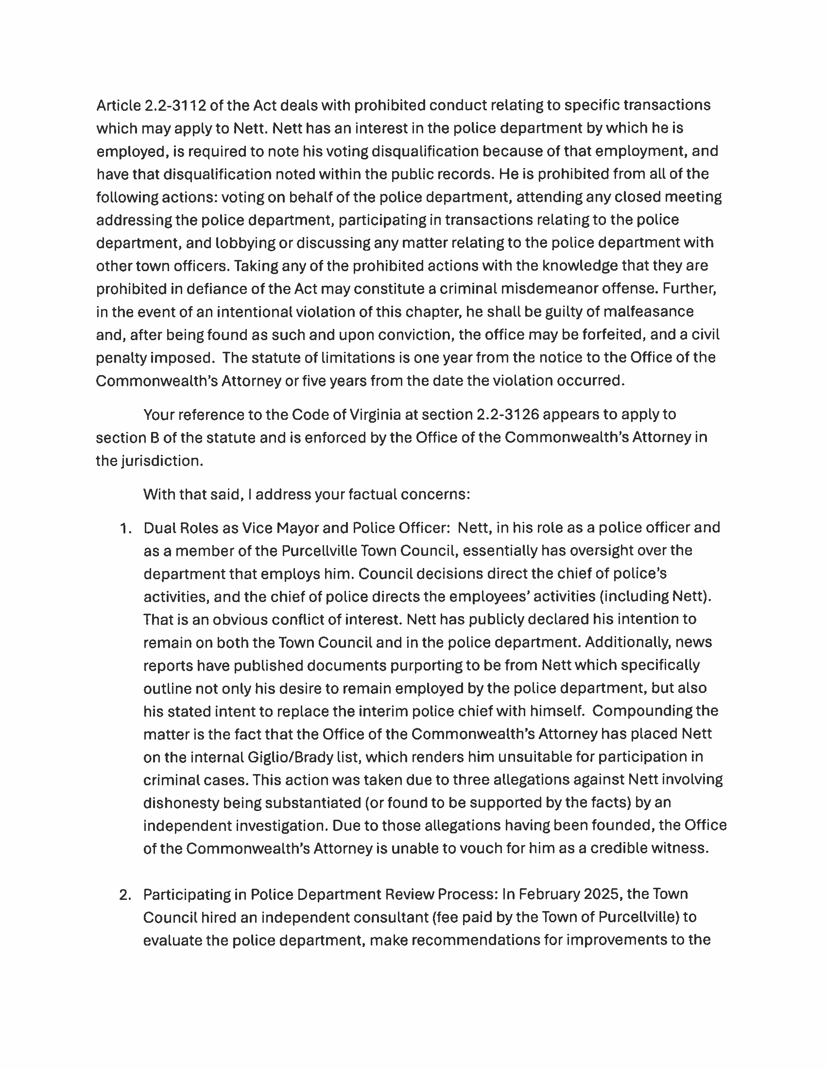 Commonwealth Attorney’s letter addresses specific concerns regarding Nett’s actions, highlighting several critical issues: