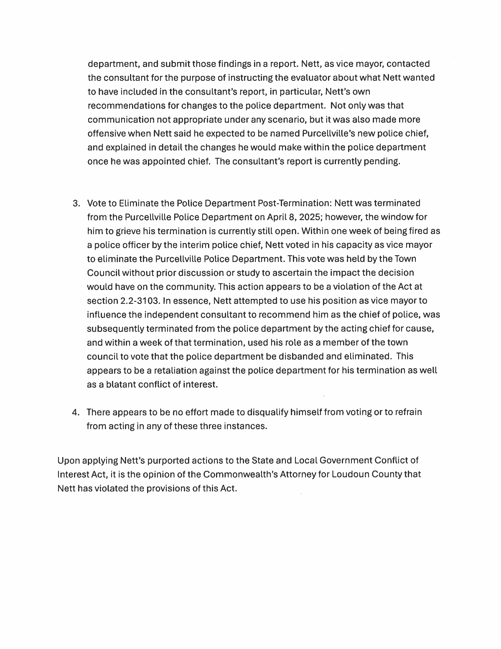 Ultimately, Commonwealth Attorney Bob Anderson concluded that Vice Mayor Nett has violated the provisions of the State and Local Government Conflict of Interest Act through his actions.