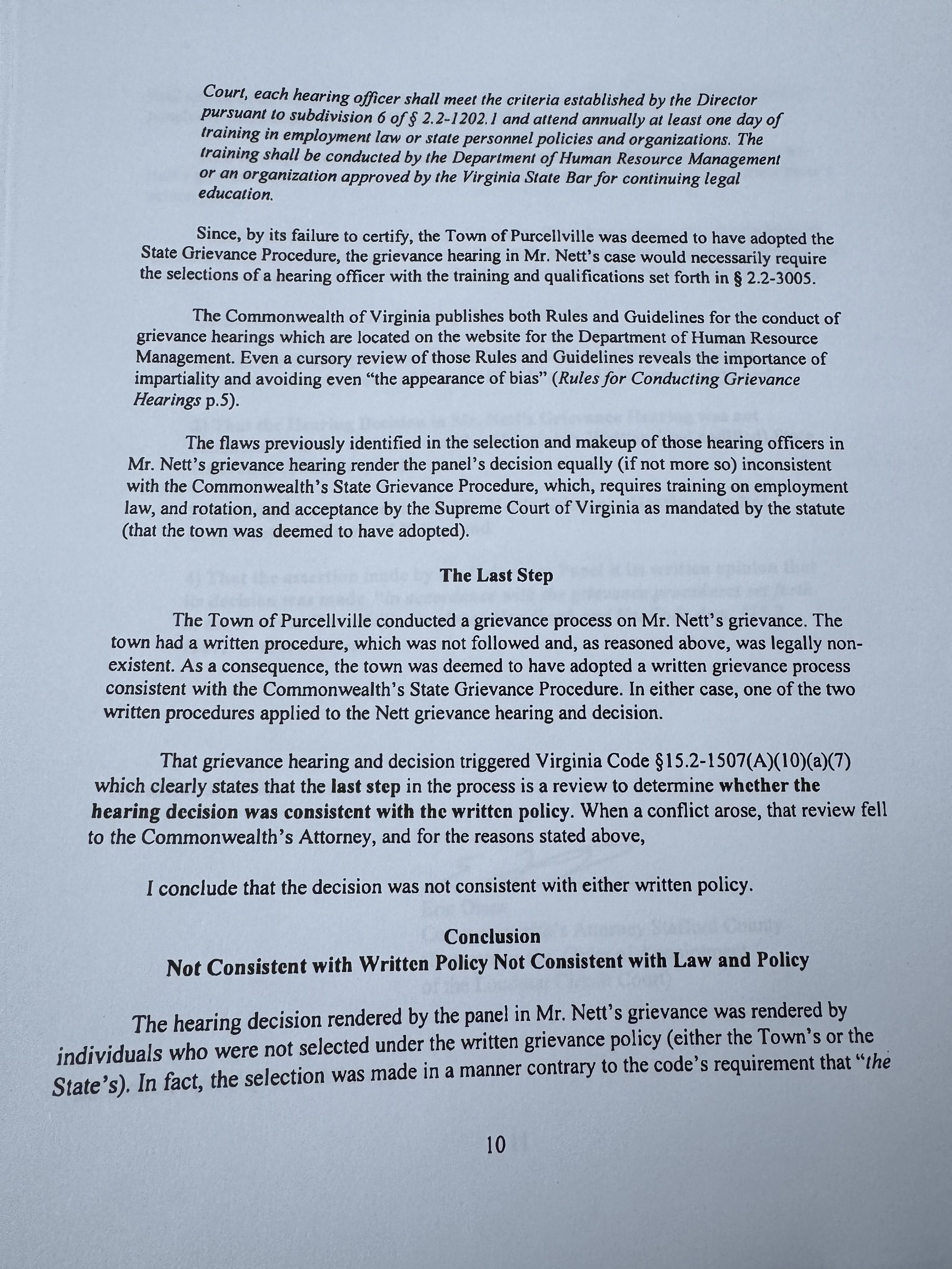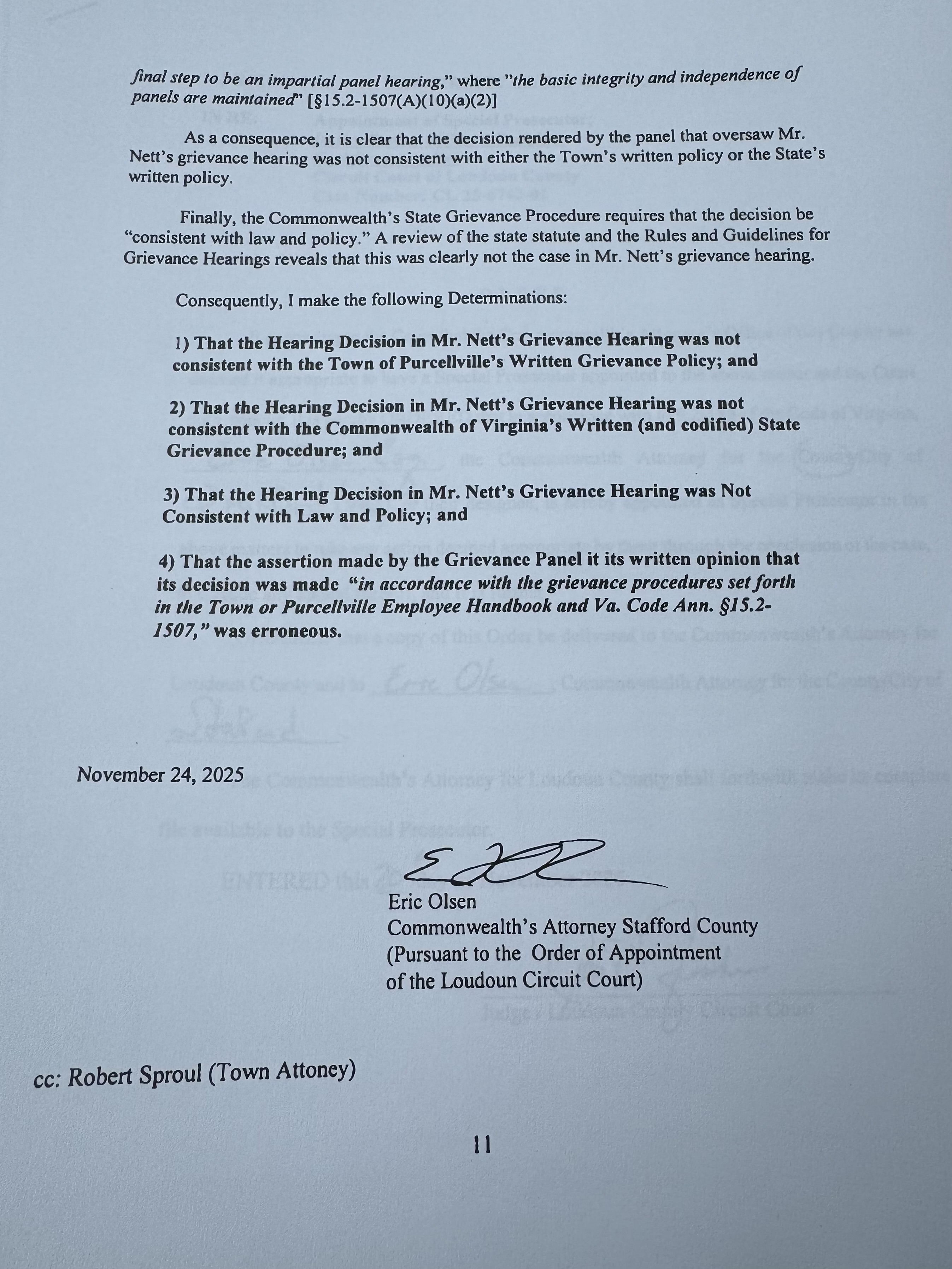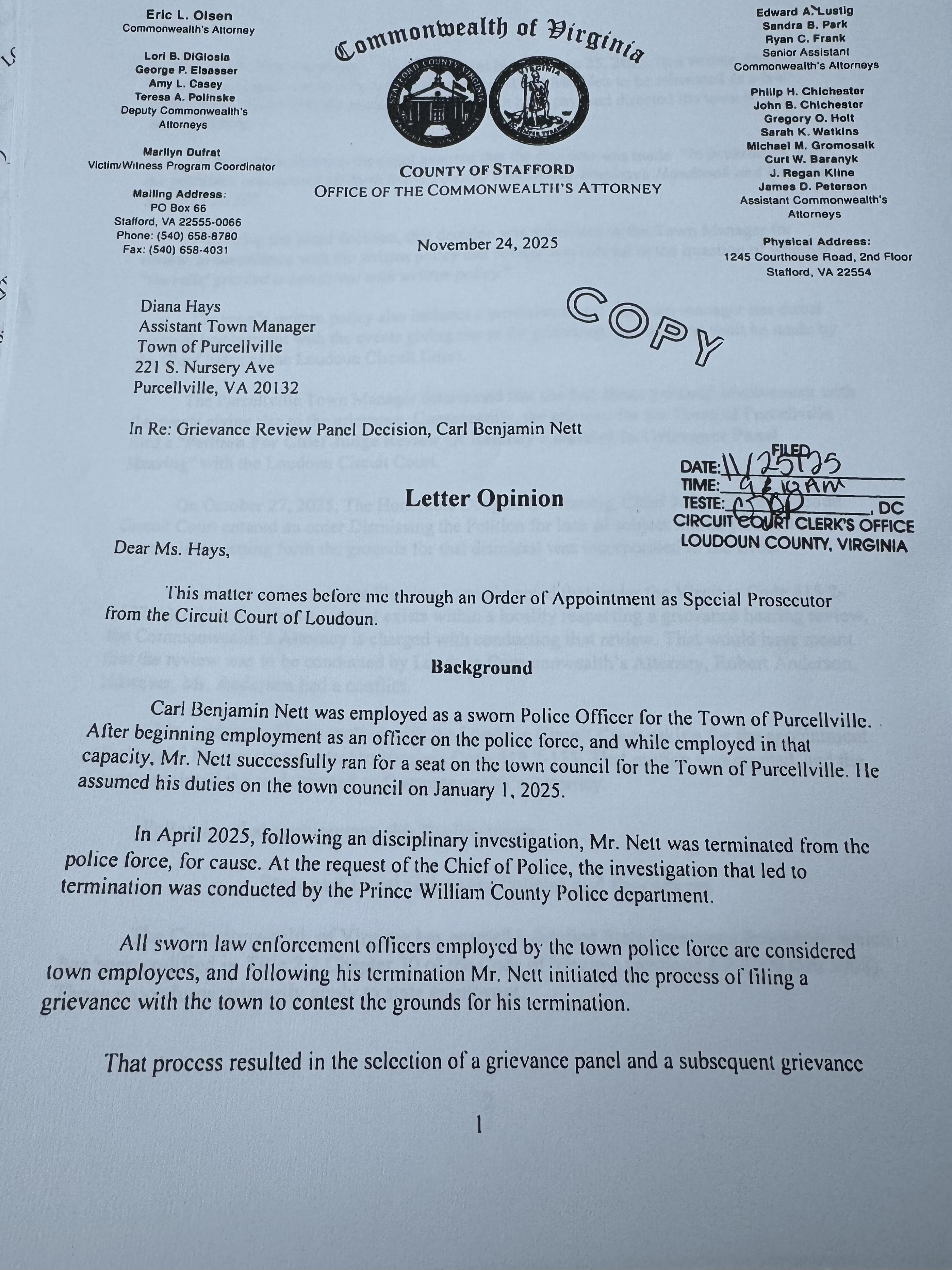 Purcellville Va – On November 25, 2025, a 11-page review conducted by Special Prosecutor Eric Olsen concluded that the grievance hearing and its decision regarding former police officer Carl Benjamin Nett were inconsistent with both the Town of Purcellville’s written grievance policy and the Commonwealth of Virginia’s State Grievance Procedure.  As a result, the decision to reinstate Nett, including the award of back pay and legal fees, is deemed invalid under the applicable legal and procedural standards.