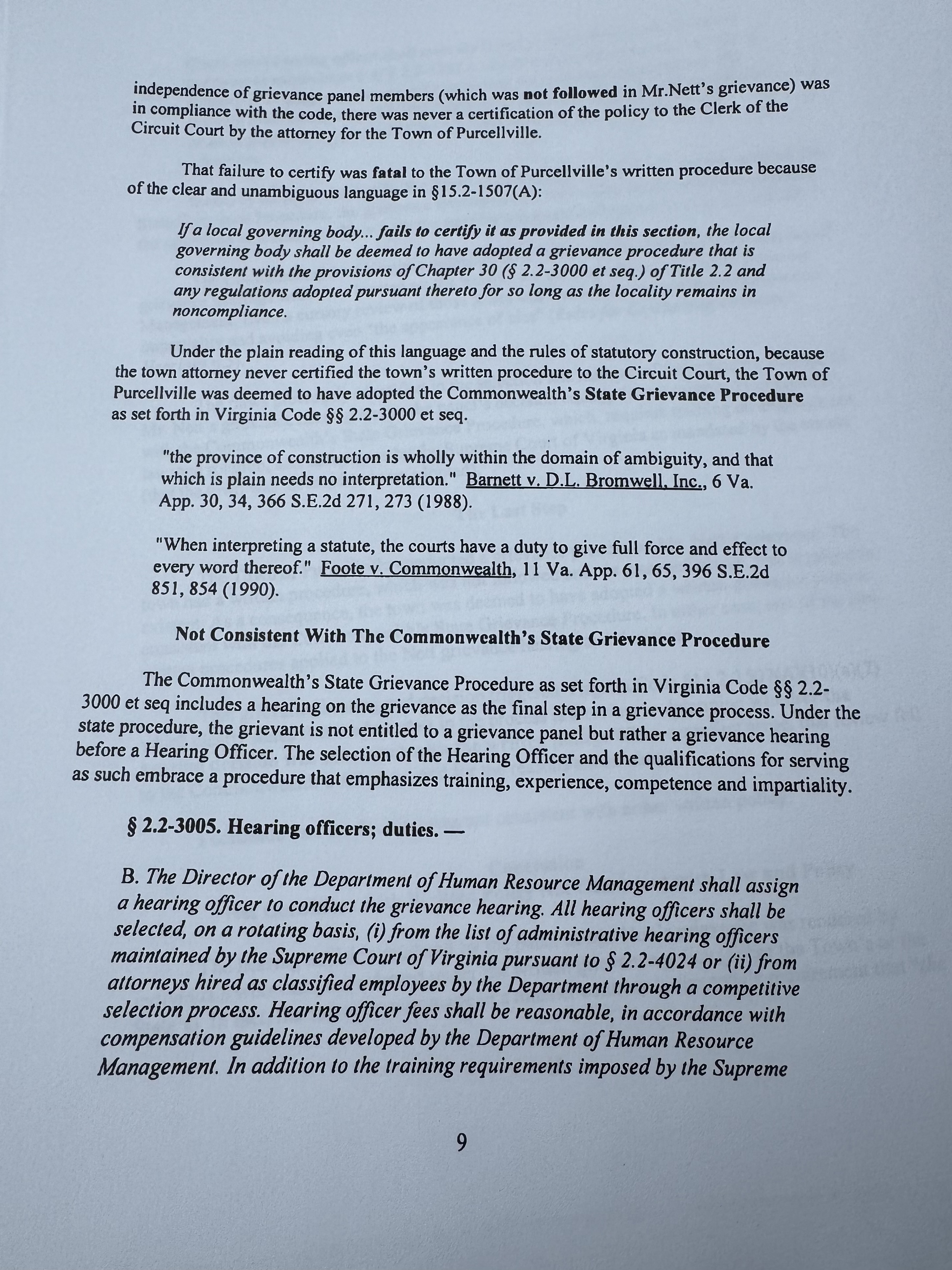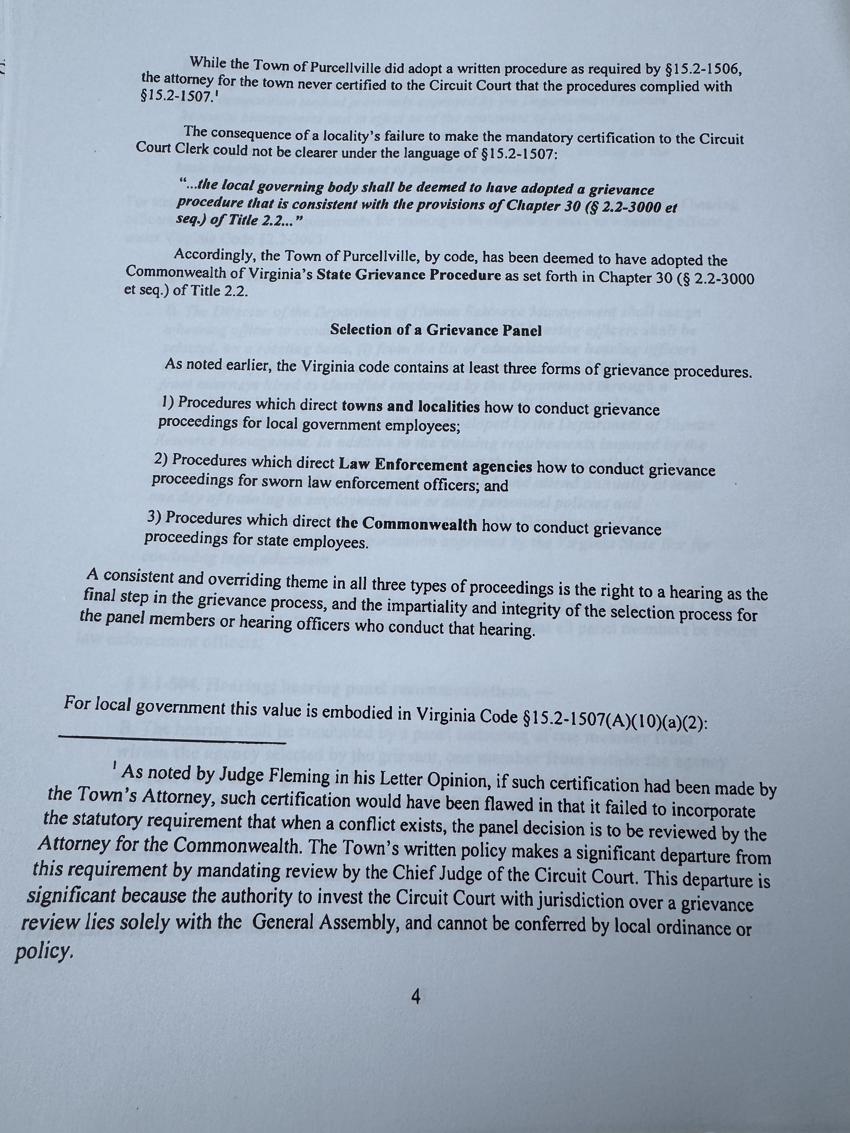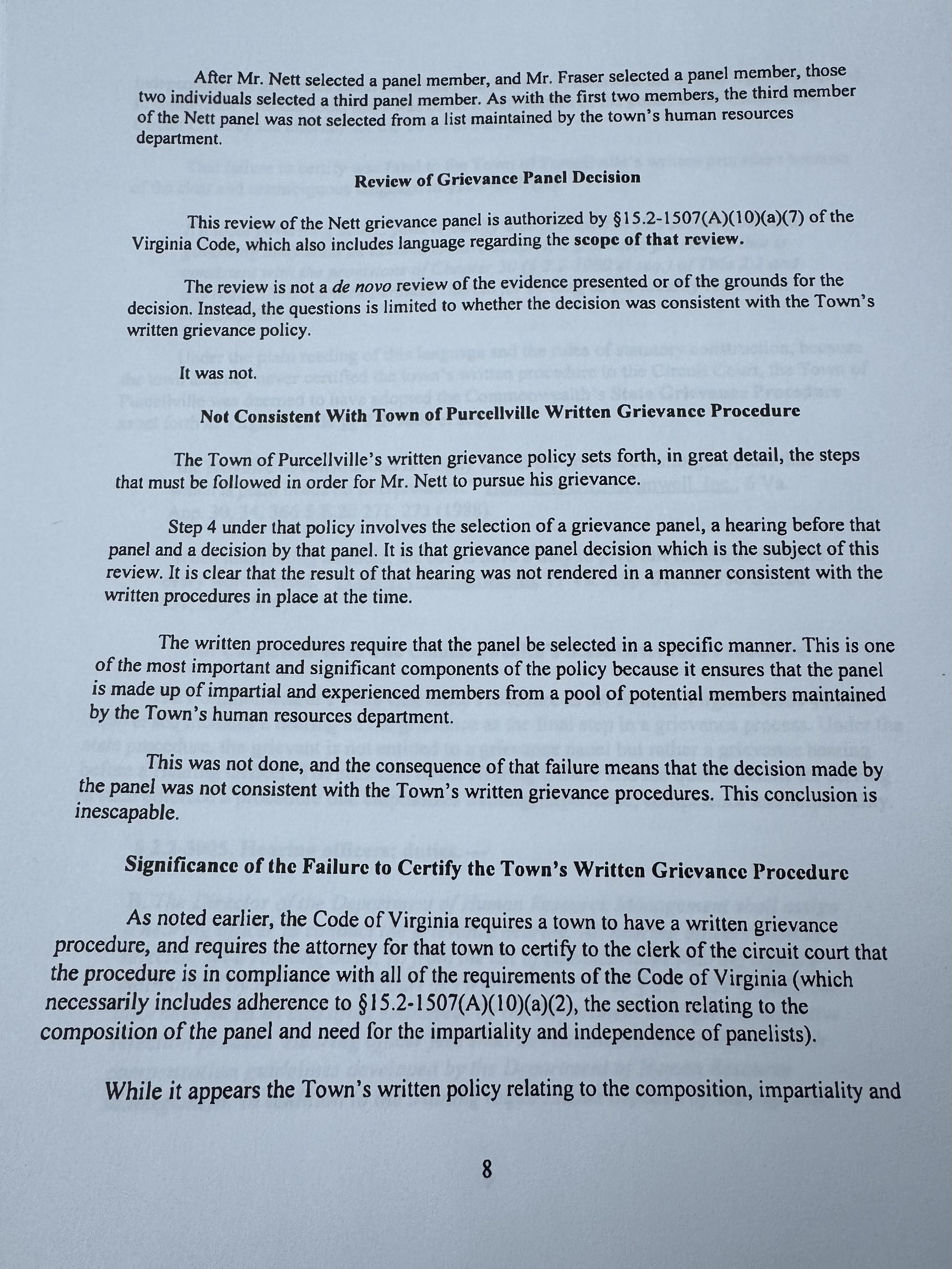 Upon review, a Special Prosecutor found that the grievance panel did not adhere to the required selection process, as members were not chosen from a designated list, compromising the impartiality expected under both town and state procedures. This led the Loudoun Circuit Court to dismiss the town’s appeal based on jurisdictional grounds, emphasizing further procedural concerns.