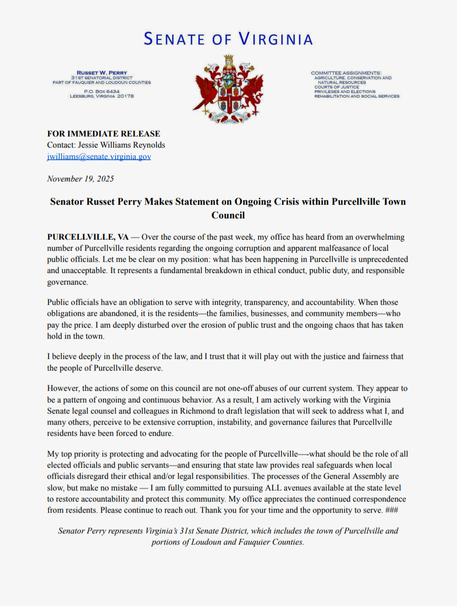 PURCELLVILLE, VA – On November 19, 2025, Senator Russet Perry addressed concerns regarding the ongoing situation within the Purcellville Town Council, following feedback from numerous residents who have expressed worries about alleged corruption among local officials.