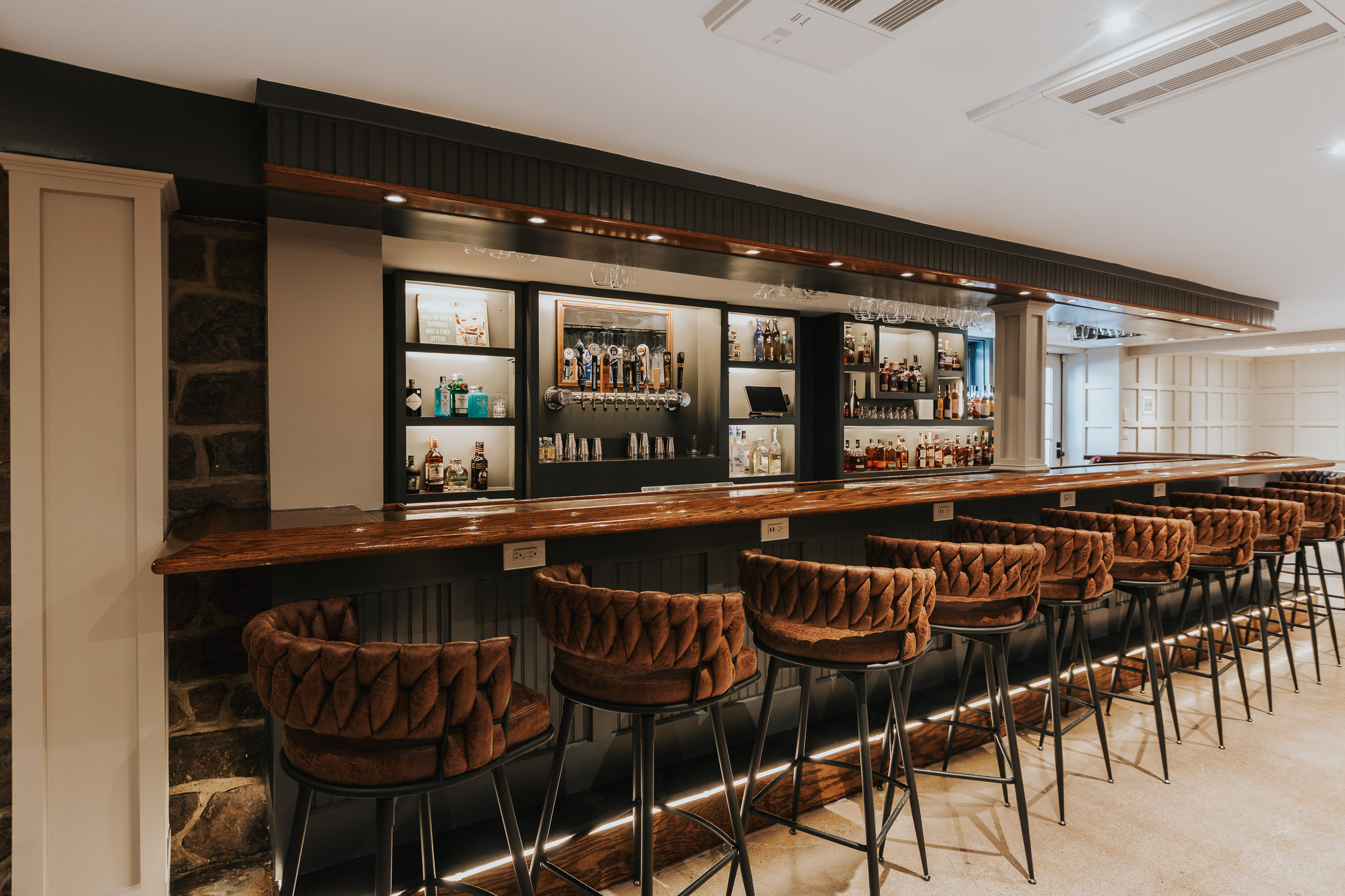 The main dining areas feature gorgeous woodwork, exposed brick archways, and picturesque views of the surrounding greenspace and gardens, creating a warm and inviting atmosphere. Guests can also unwind in the expansive bar area, complete with lounge seating and the original stone fireplace from the Inn, providing a cozy setting for relaxation and conversation.